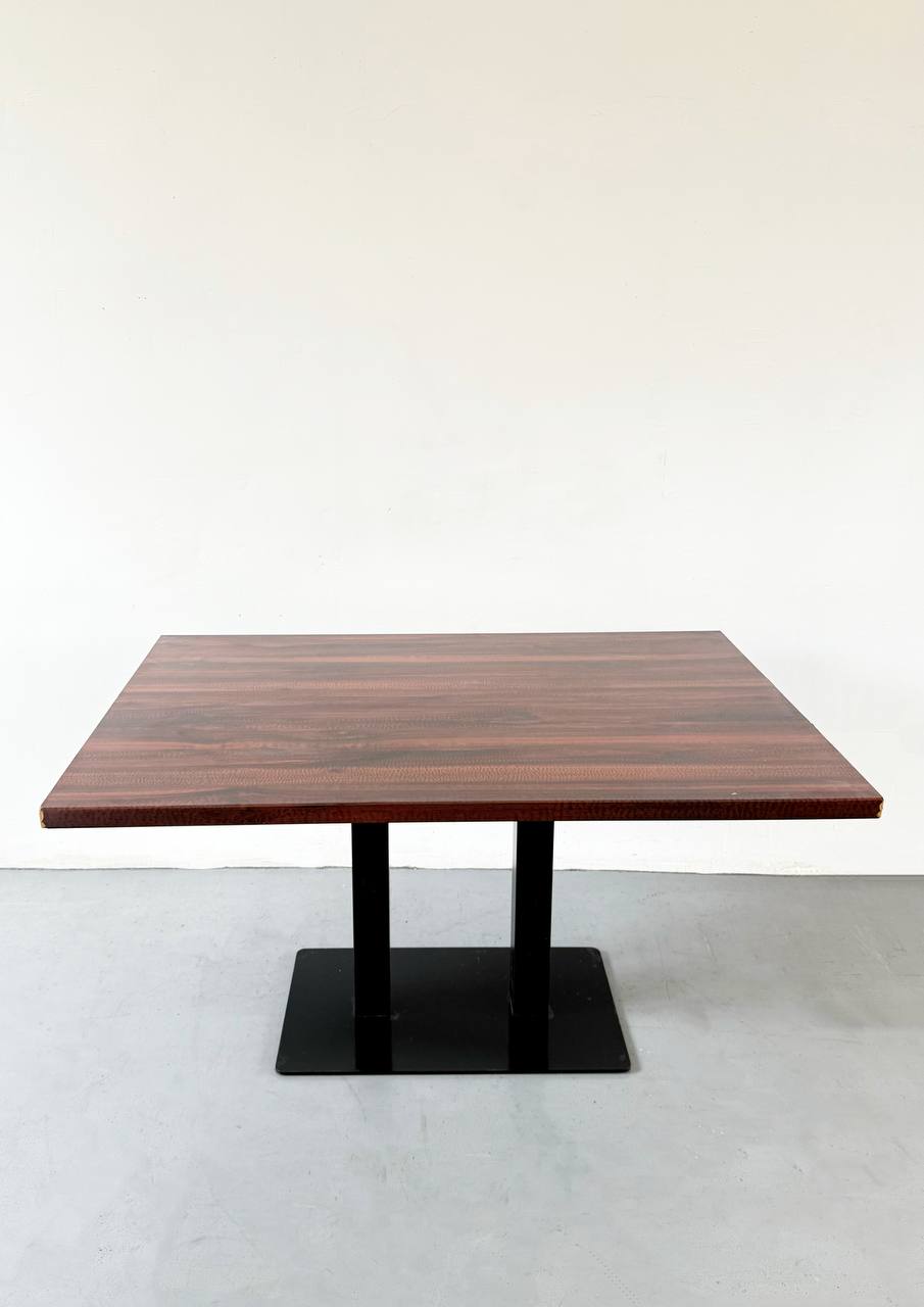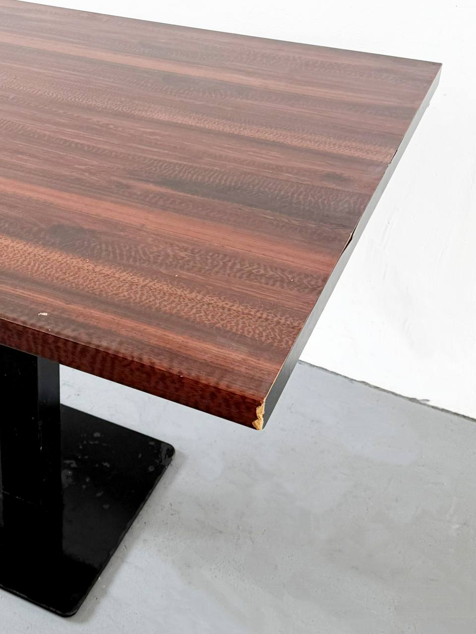 Kvalitní jídelní stůl s laminovanou deskou v dekoru tmavého dřeva a pevnou černou kovovou podnoží. Vhodný pro vnitřní použití – ideální do jídelen, restaurací, kaváren, kanceláří nebo domácností.