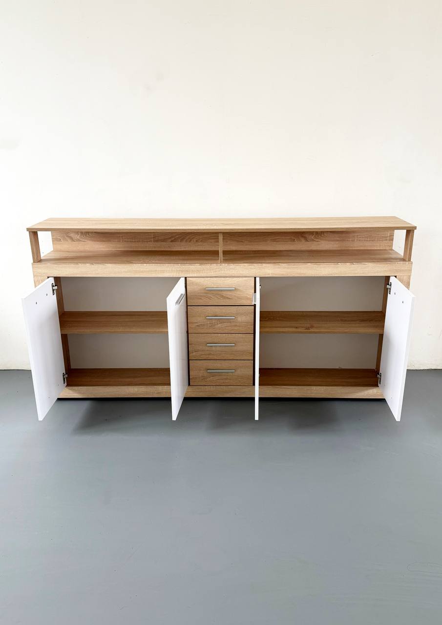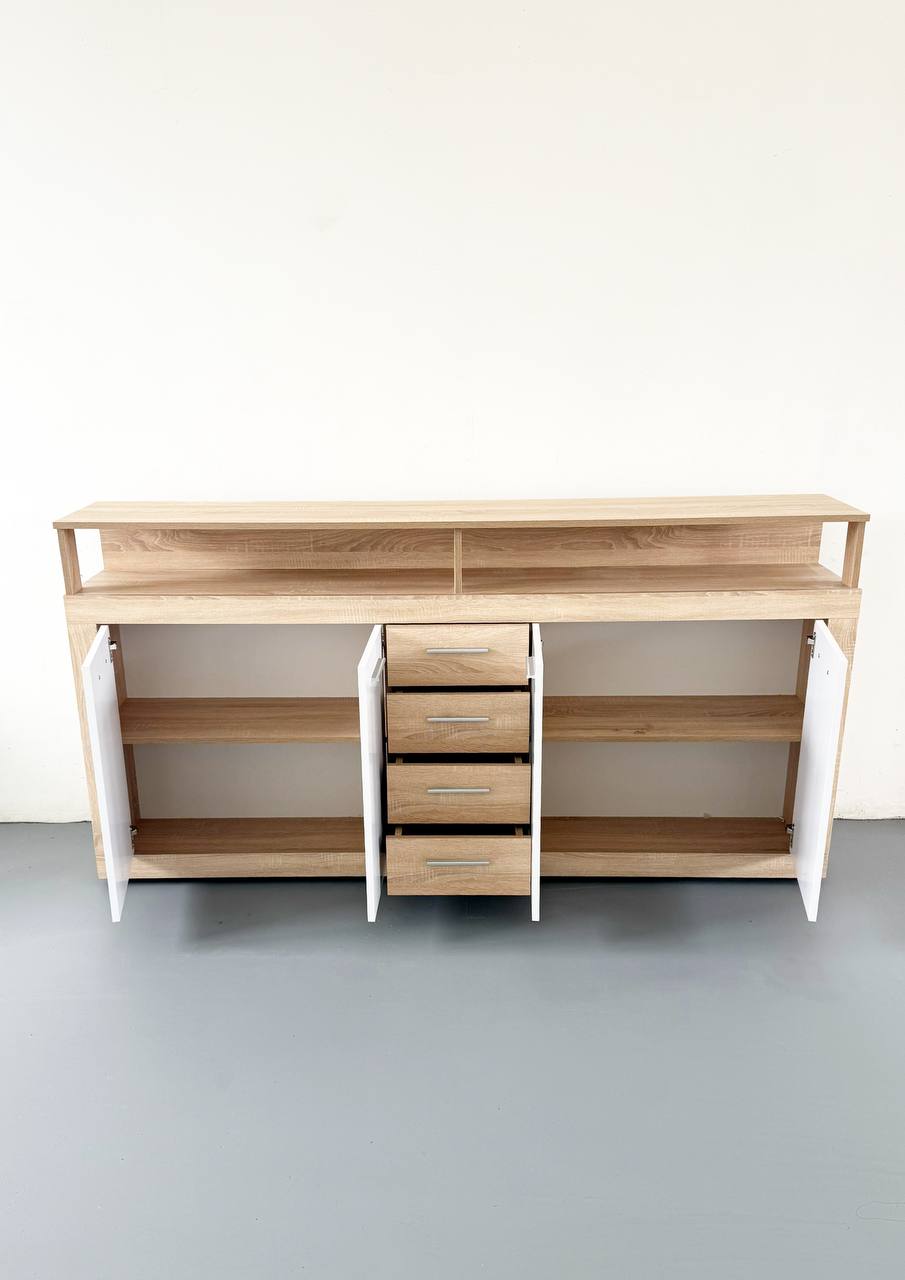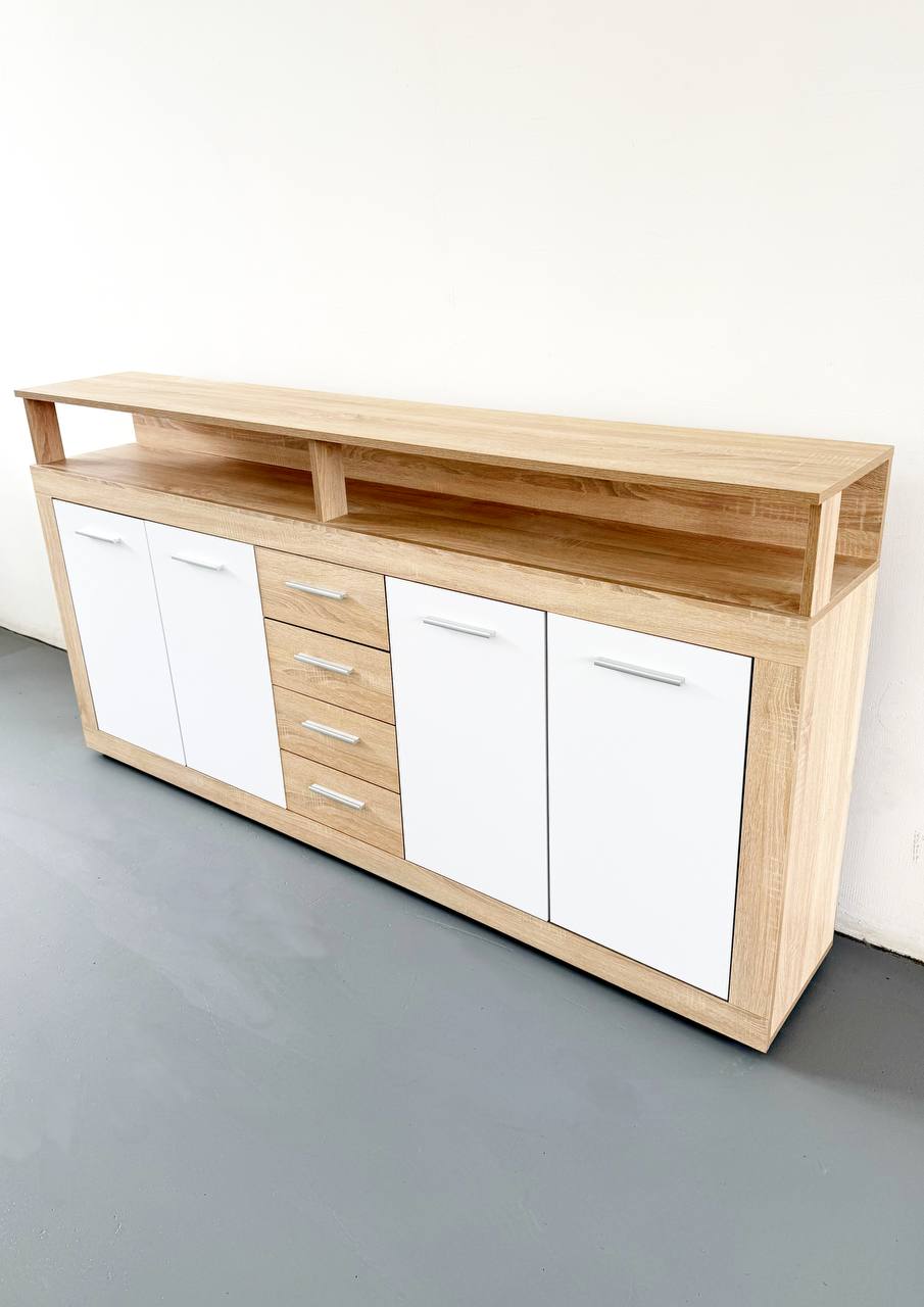 Tato velká multifunkční komoda spojuje moderní design s maximální praktičností. Je vyrobena v příjemném dekoru dub sonoma v kombinaci s kontrastními bílými dvířky, což z ní dělá univerzální kus nábytku vhodný do každého interiéru – od minimalismu až po klasiku.