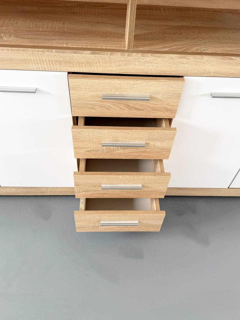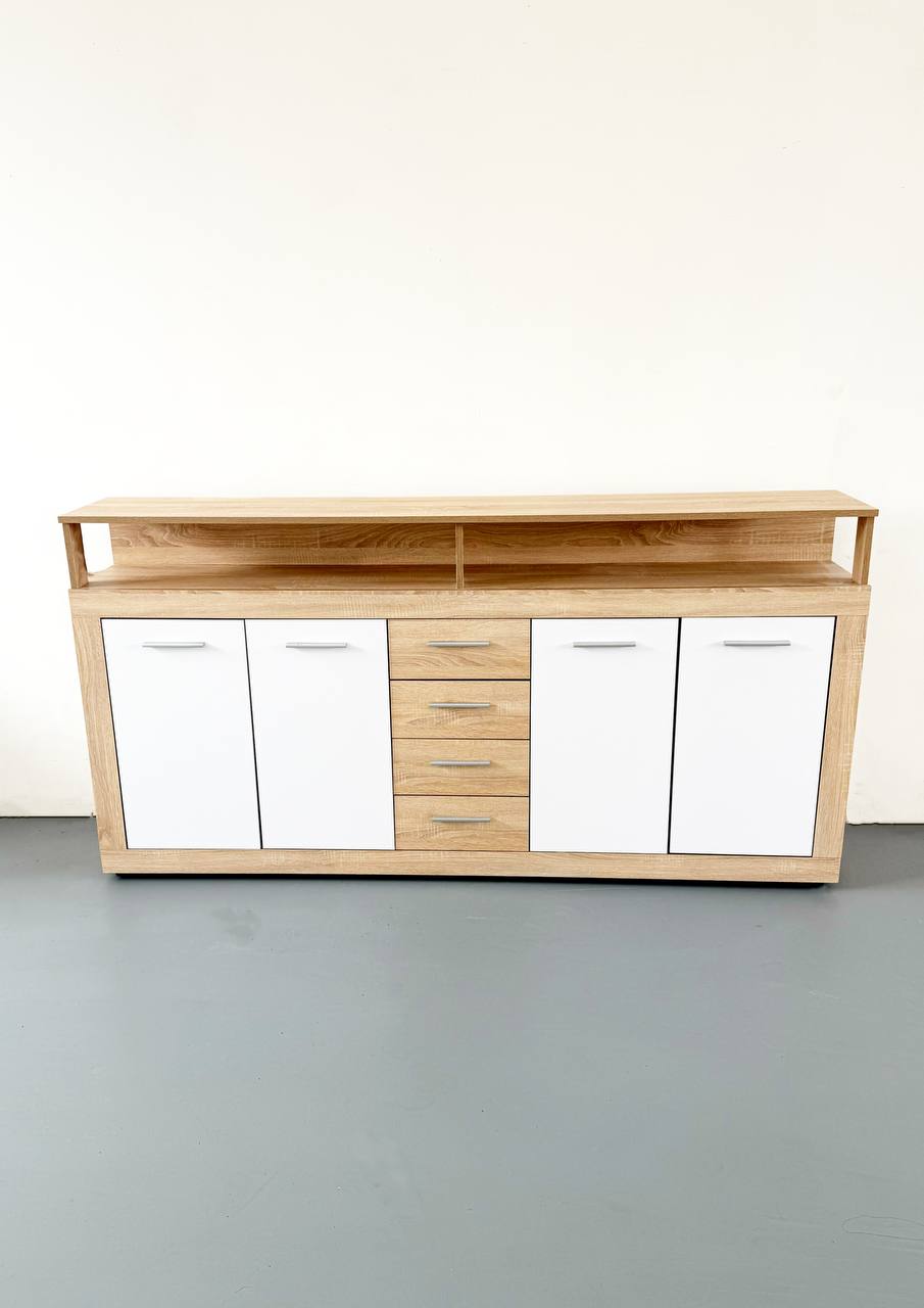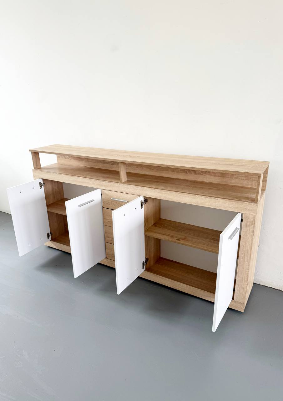 Tato velká multifunkční komoda spojuje moderní design s maximální praktičností. Je vyrobena v příjemném dekoru dub sonoma v kombinaci s kontrastními bílými dvířky, což z ní dělá univerzální kus nábytku vhodný do každého interiéru – od minimalismu až po klasiku.