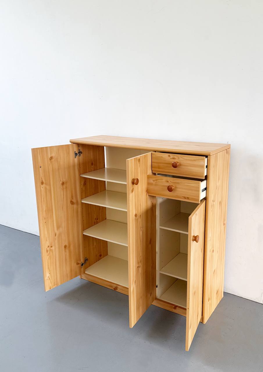 Tato skříň spojuje kompaktnost a prostornost, provedená v teplých dřevěných tónech, které dodají interiéru útulnost. Je univerzálním řešením pro ukládání věcí v jakékoli místnosti.