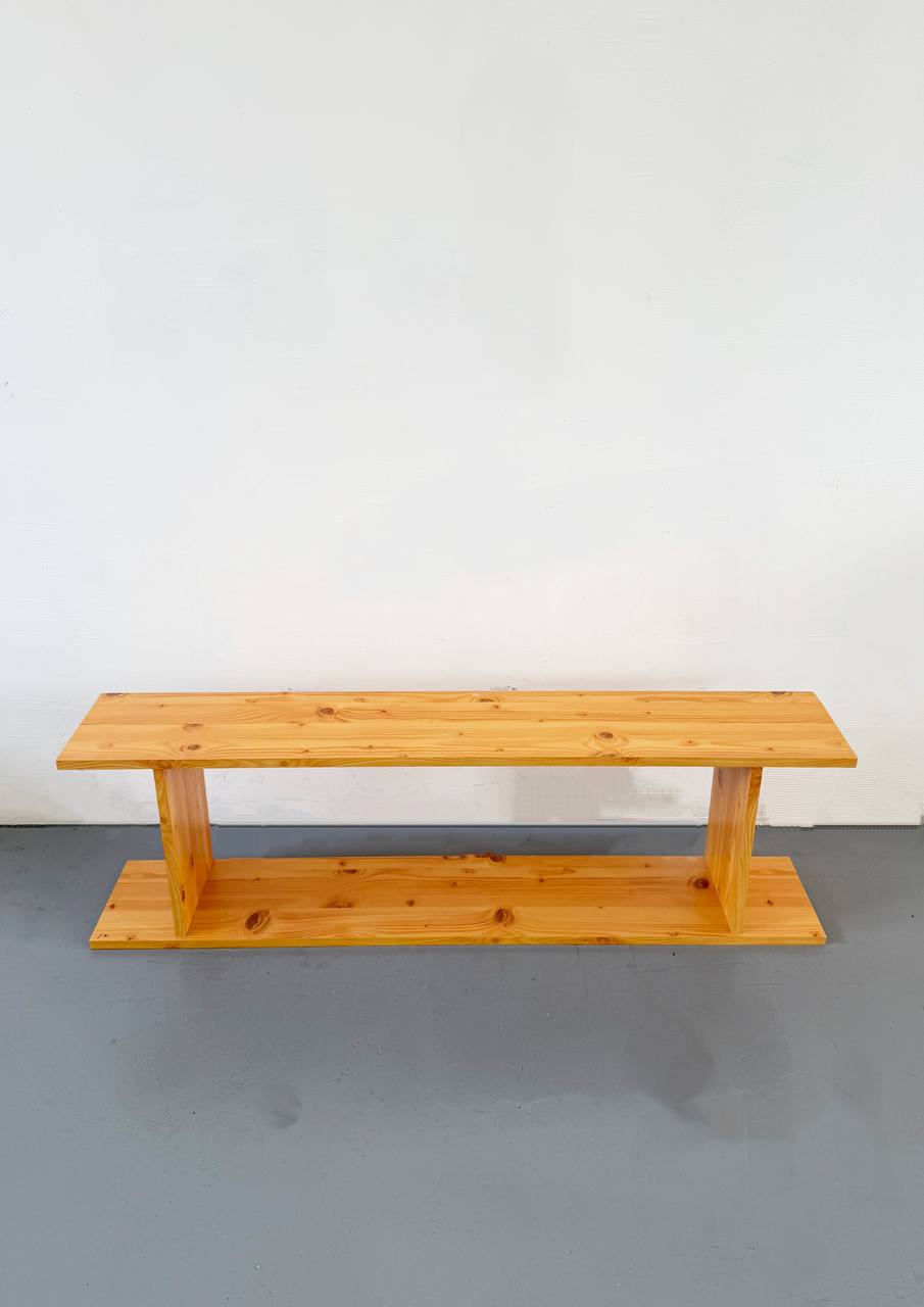 Nástěnná police z přírodního dřeva ve světlém odstínu. Má dvě dlouhé horizontální plochy a střední vertikální výztuhy pro větší stabilitu.…