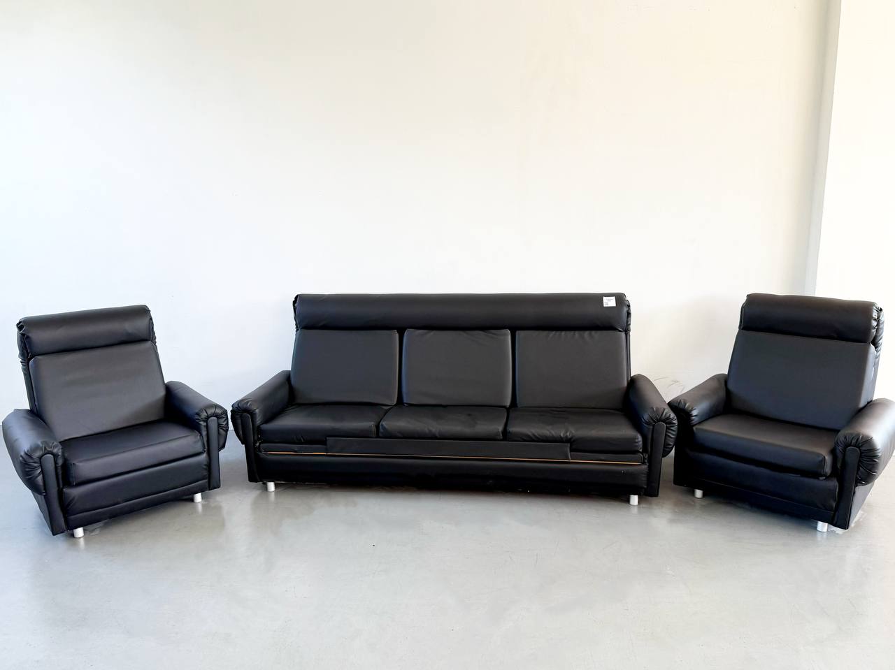 Sada čalouněného nábytku v klasickém, ale zároveň moderním stylu, která se skládá z jedné třímístné pohovky a dvou prostorných křesel. Čalounění je vyrobeno z kvalitní černé eko kůže, která dodává elegantní a reprezentativní vzhled a současně zajišťuje snadnou údržbu. Hluboké sedáky a měkká výplň poskytují vysoký komfort při sezení, zatímco vysoké opěrky zad s podporou krční a ramenní části napomáhají správnému držení těla a odlehčují páteři.