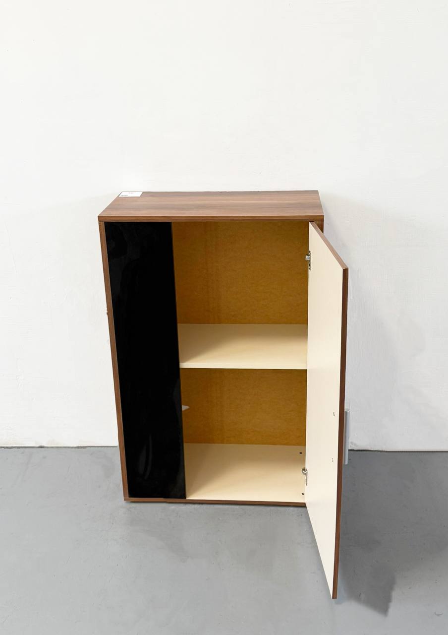 Kompaktní skříňka s moderním designem. Vyrobena v kombinaci dřevodekoru a černého lesklého prvku, který dodává výrobku elegantní vzhled. Má jedny dveře se stříbrnou úchytkou. Uvnitř se nachází jedna police, která vytváří dva praktické úložné prostory. Vhodná do menších místností, kanceláře nebo předsíně.