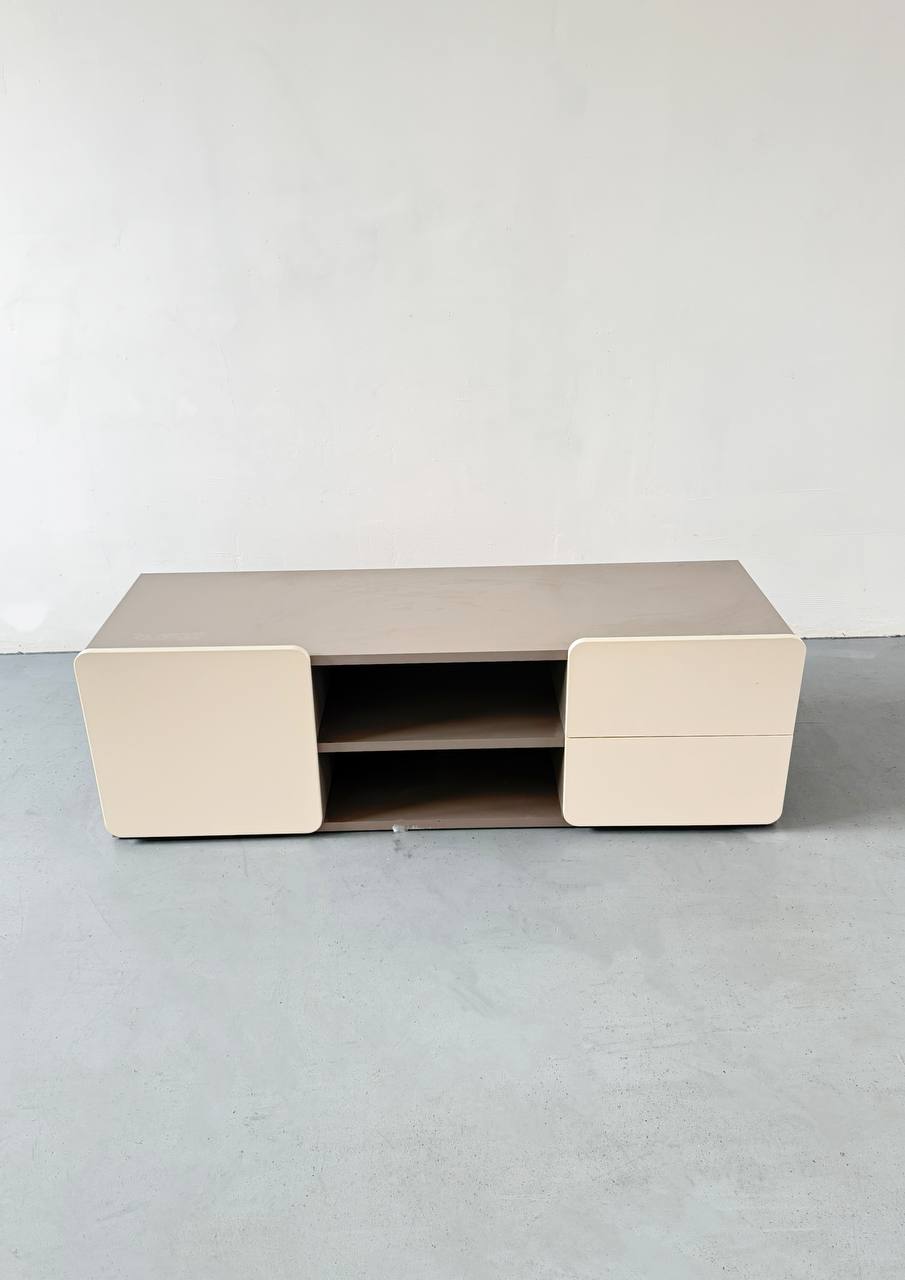 Funkční komoda v neutrální béžové barvě s jemně zaoblenými tvary. Nabízí dva výsuvné šuplíky na jedné straně, skříňku s dvířky na druhé a otevřené police uprostřed – ideální pro techniku, dekorace nebo jiné předměty. Vhodná pod televizi i jako úložný nábytek do obývacího pokoje nebo ložnice.