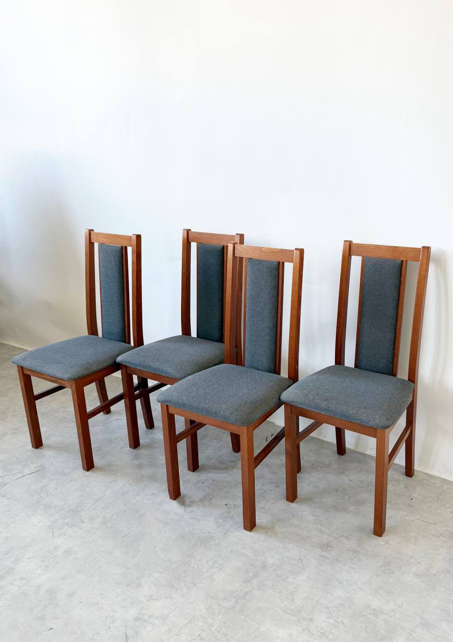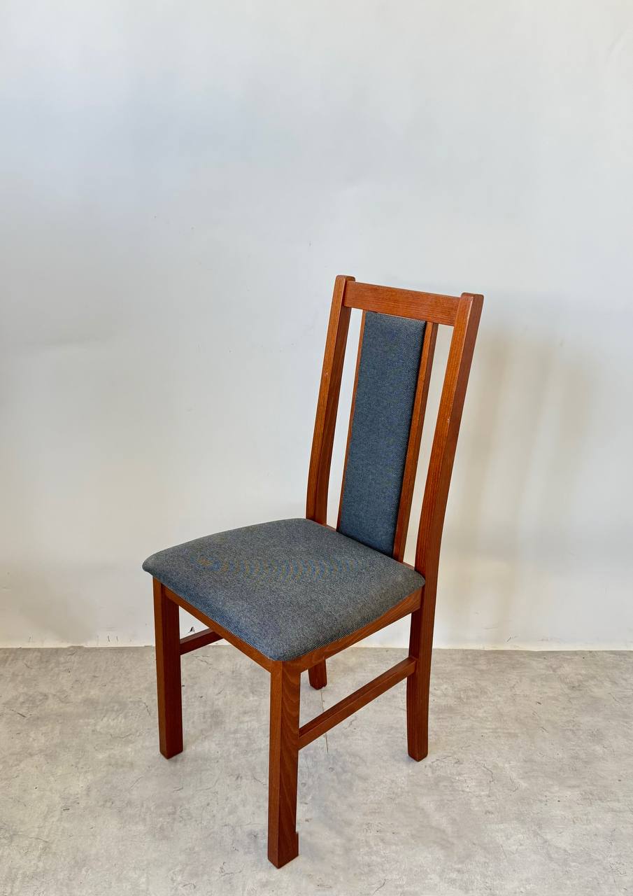 Klasická židle z pevné dřevěné konstrukce spojuje odolnost a pohodlí. Opěradlo je doplněno měkčenou čalouněnou vložkou, která zvyšuje komfort při sezení. Sedák je potažen látkou v šedo-modrém odstínu, která krásně kontrastuje s teplým tónem dřeva.
